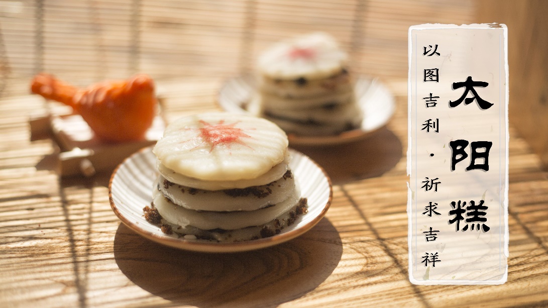 太陽(yáng)糕,又稱太陽(yáng)雞糕,是二月二的節(jié)令小食,《燕京歲時(shí)記》道:“二月初一日,市人以米面團(tuán)成小餅,五枚一層,上貫以寸余小雞,謂之‘太陽(yáng)糕’,都人祭日者買而供之,三五具不等!